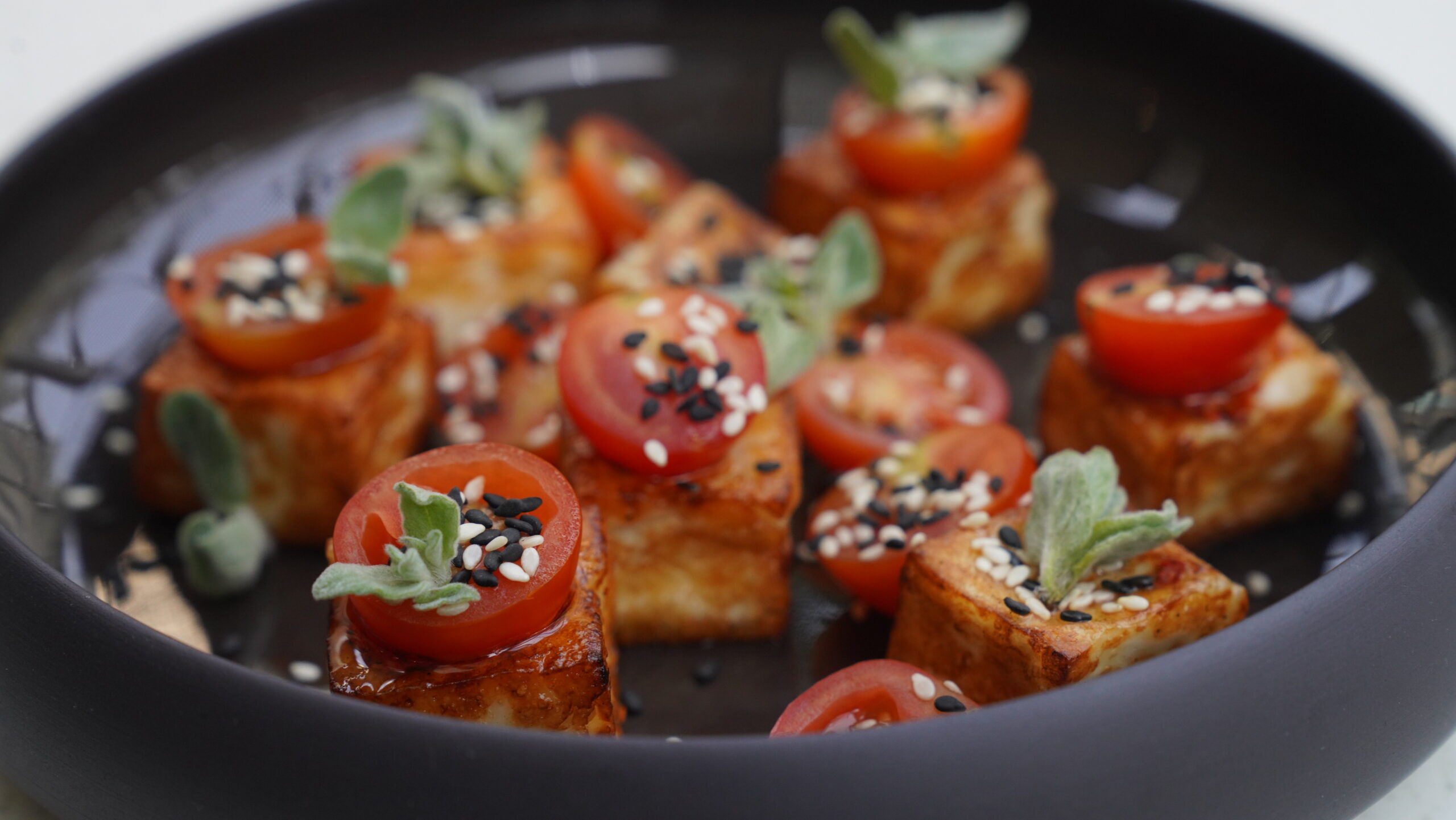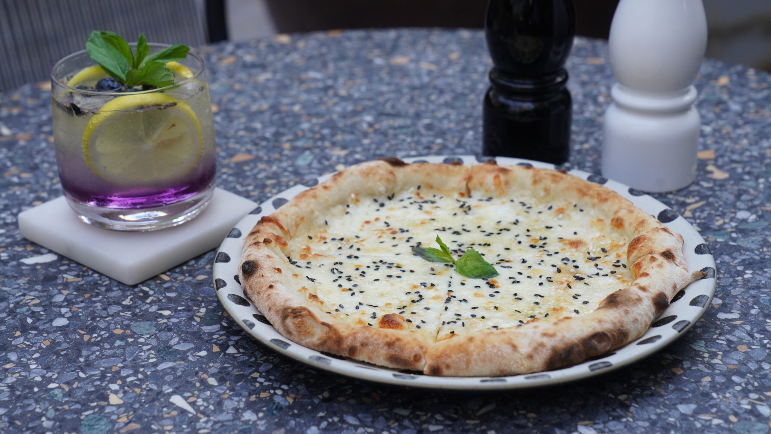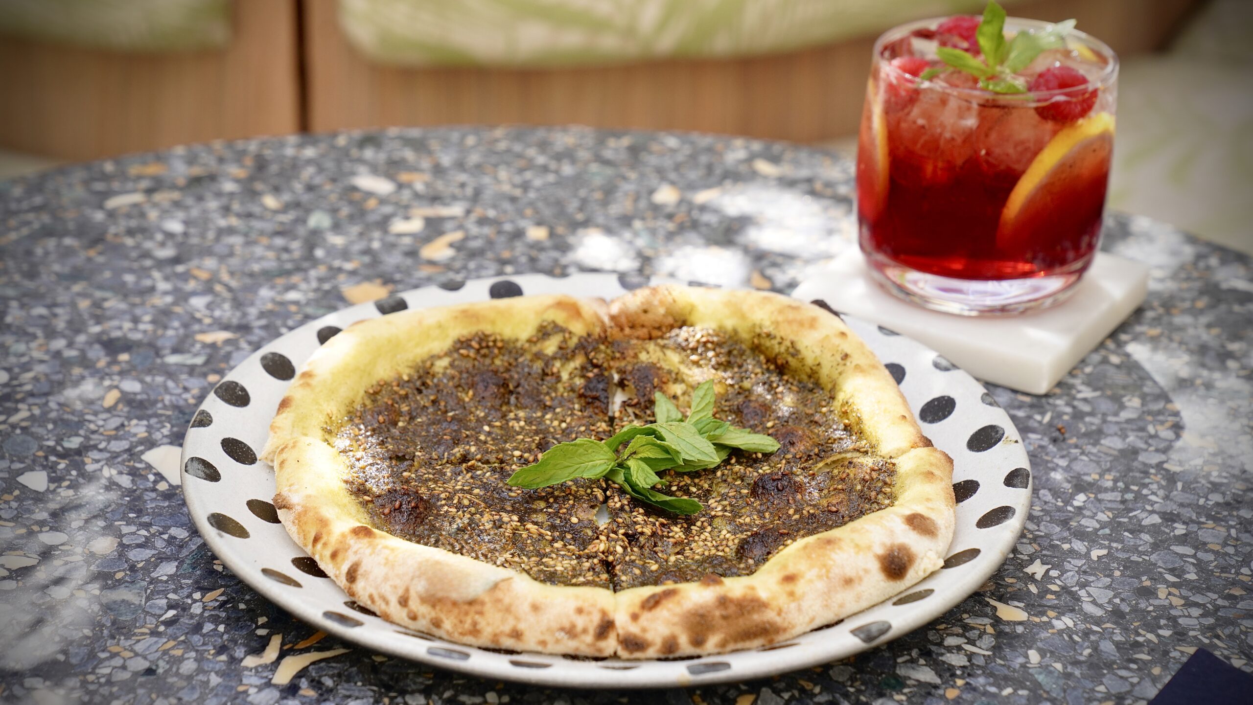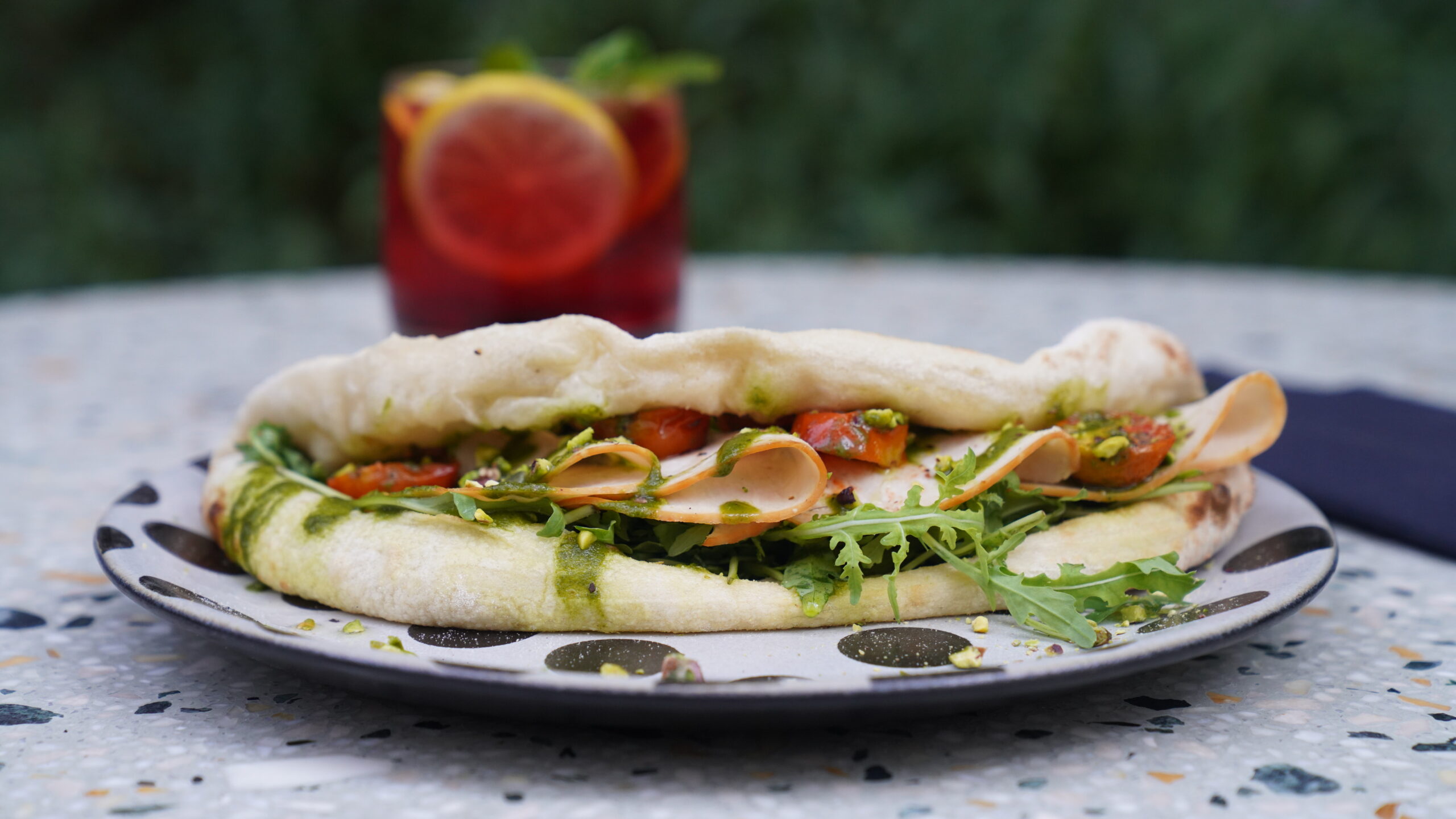 Homemade Simit, Whipped Herb Yogurt, Baby Rocket, Grilled Halloumi, Seared Mushrooms, Baby Spinach, Pistachio Pesto, Side Salad